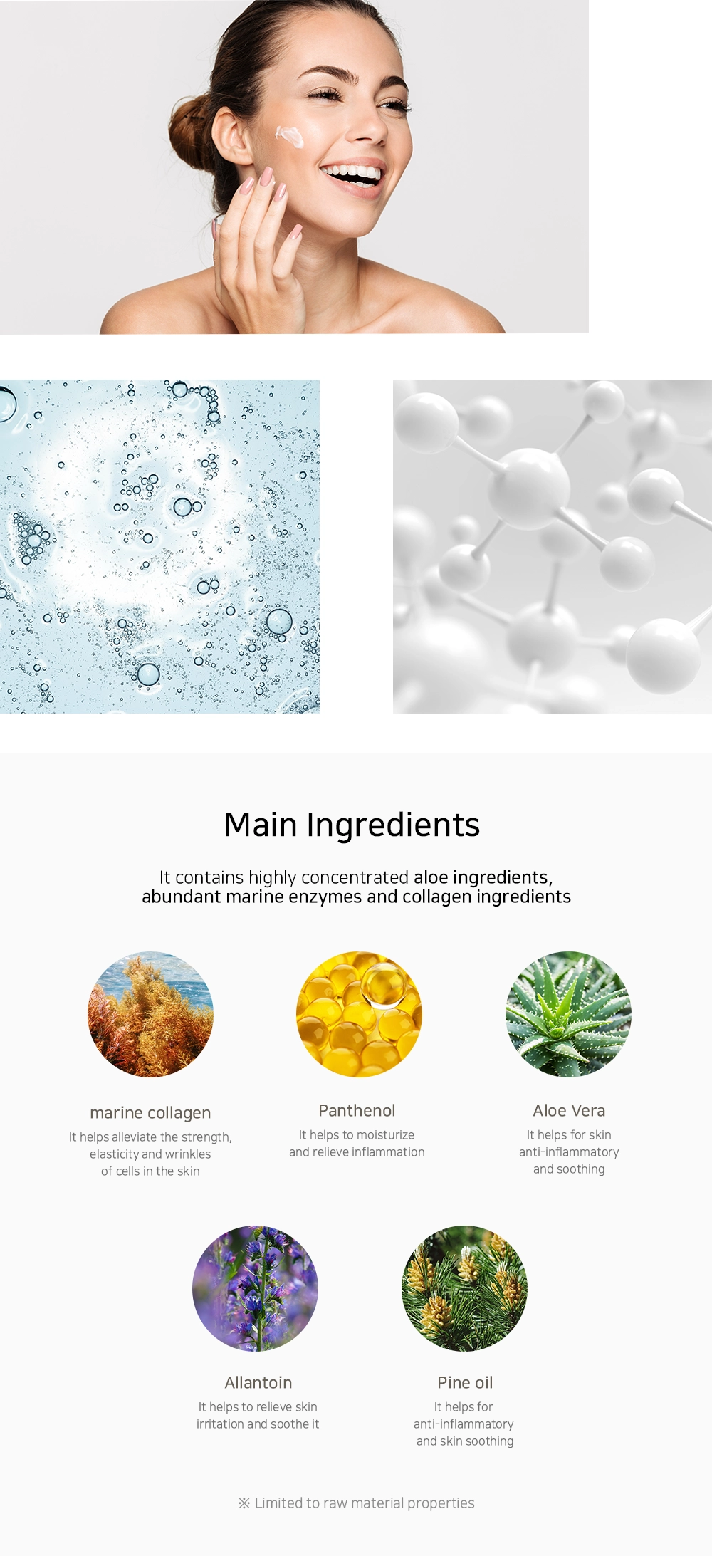 -Colágeno marino: Ingrediente de alta pureza extraído de fuentes marinas, que refuerza la estructura dérmica, mejora la elasticidad y ayuda a disminuir la profundidad de las arrugas. Su excelente afinidad con la piel favorece la regeneración y previene la pérdida de firmeza.