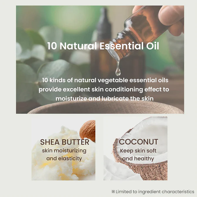 Ingredientes: Palmitato de etilhexilo, Etilhexanoato de cetilo, Triisostearato de glicerilo PEG-20, Polietileno, Isostearato PEG-8, 1,2-Hexanodiol, Manteca de karité, Acetato de tocoferilo, Aceite de cáscara de naranja, Aceite de lavanda, Aceite de flor de pelargonio graveolens, Aceite de corteza de amyris balsamifera, Aceite de hoja de eucalipto globulus, Aceite de hoja de árbol de té, Aceite de cáscara de pomelo, Aceite de fruto de bergamota, Aceite de boswellia carterii, Aceite de juniperus mexicana, Agua, Extracto de fruto de coco, Glicol de butileno, Extracto de fruto de lima, Ácido cítrico, Fenoxietanol, Extracto de flor de nelumbium speciosum, Extracto de freesia refracta, Extracto de rosa, Extracto de leontopodium alpinum, Extracto de jazmín, Extracto de flor de narciso pseudonarciso, Extracto de lirio tigrinum, Extracto de iris versicolor, Etilhexilglicerina, Limoneno, Citral, Linalool