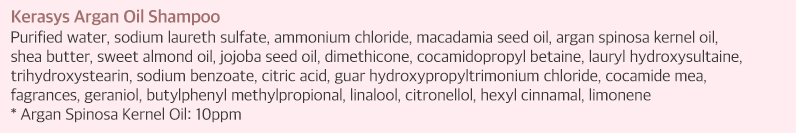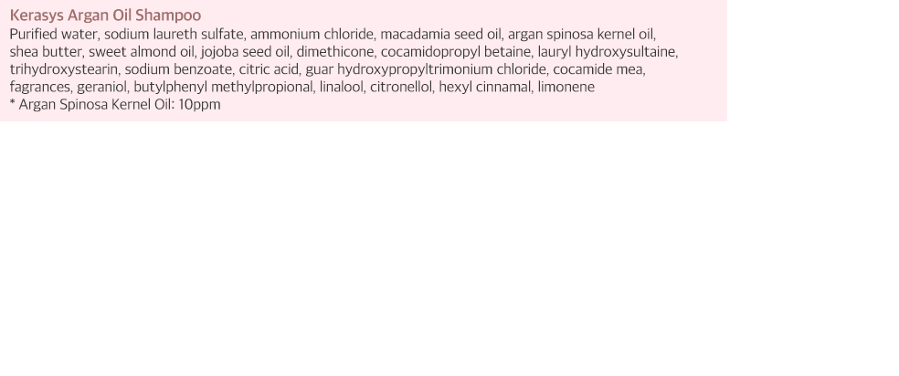 Ingredientes: Aqua, Sodium Laureth Sulfate, Cocamidopropyl Betaine, Glycol Distearate, Argania Spinosa Kernel Oil, etc.