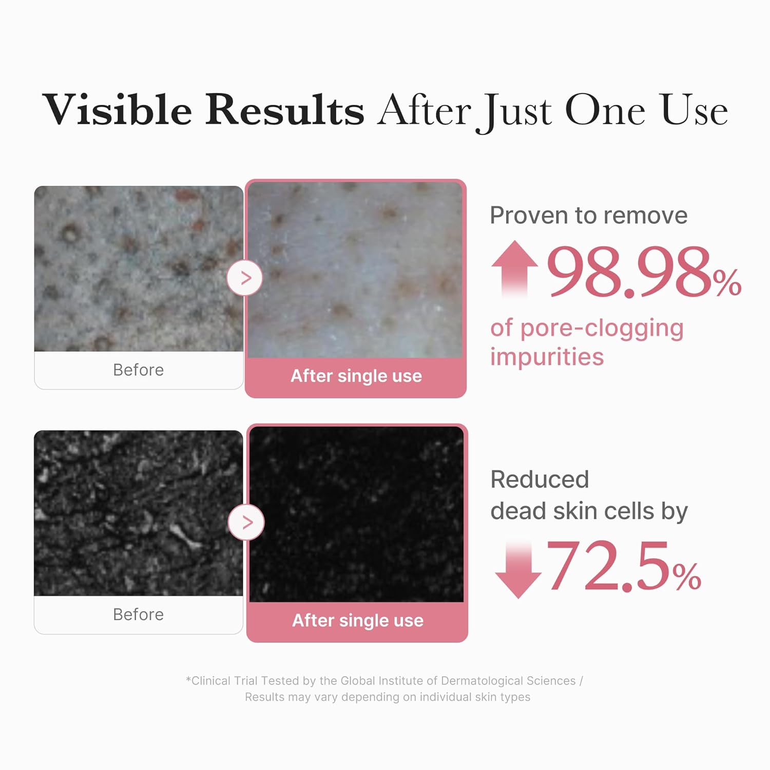 Su innovadora fórmula elimina hasta el 98,98 % de las impurezas que obstruyen los poros y reduce un 72,5 % las células muertas desde el primer uso, dejando la piel suave, renovada y visiblemente radiante.