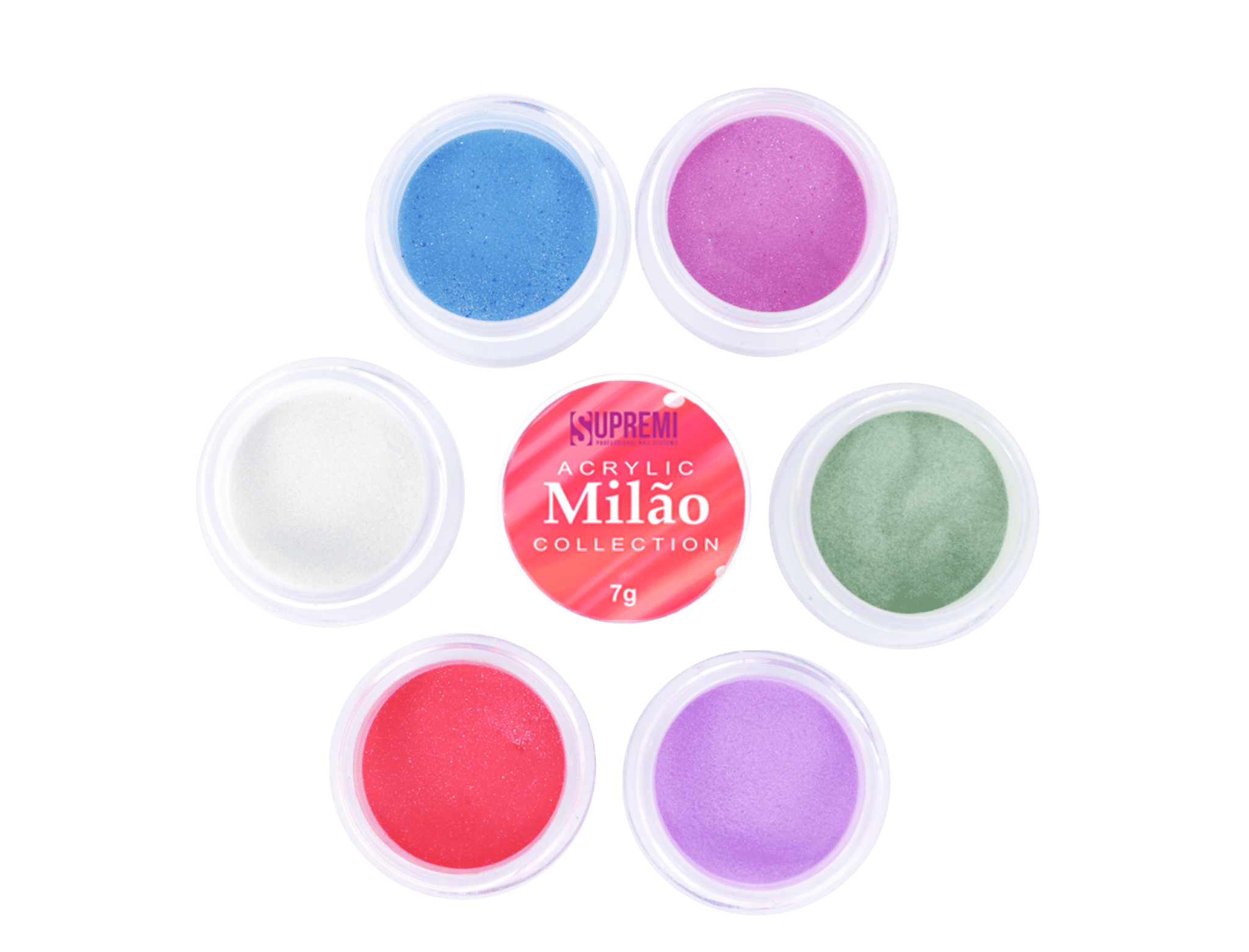 Set de Polvos acrílicos Milan de Supremi, es una colección que  contiene 6 frascos de polimero acrílico de alta calidad , con pigmentación homogénea  , que  proporcionan una consistencia ideal para un acabado perfecto, adhesión superior y  es ideal para hacer relieves y diseños 3D. Tiene una fórmula autonivelante y no amarillenta la base natural de la uña. Contenido: 6 frascos de 7gr cada uno.