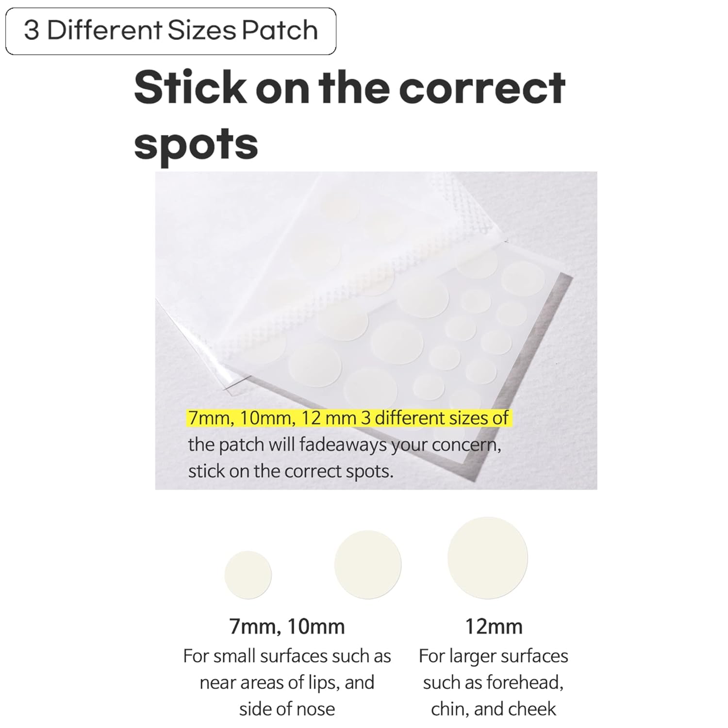 El sobre contiene 3 tamaños: 10 parches (7 mm); 5 parches  (10 mm); 9 parches (12 mm).